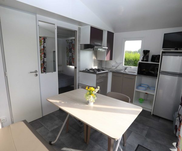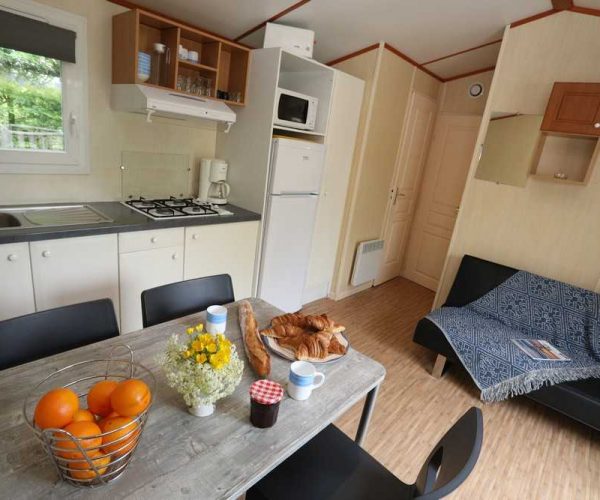 Les chalets 6 personnes sont équipés de 3 chambres (1 lit double et 4 lits simples avec oreillers et couettes, draps en option avec supplément), séjour avec kitchenette (plaque de cuisson, réfrigérateur, micro-ondes, cafetière, vaisselle, lave-vaisselle…), douche (serviettes de toilette en option avec supplément), WC, terrasse avec salon de jardin, transats et barbecue. Un espace est réservé au stationnement de votre voiture.